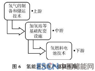 發(fā)展和推廣氫能源汽車是個復雜而系統(tǒng)的工程,單一發(fā)展某一項技術不可能實現(xiàn)成功,需要統(tǒng)籌兼顧整條產業(yè)鏈。布局好整條產業(yè)鏈的上中下游(如圖6),調動國內大型能源企業(yè)和裝備制造企業(yè)參與,共建基礎設施,多管齊下,才能為加速氫能源汽車產業(yè)的發(fā)展提供保障。