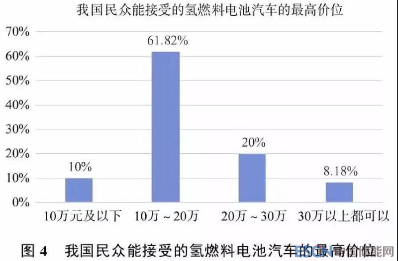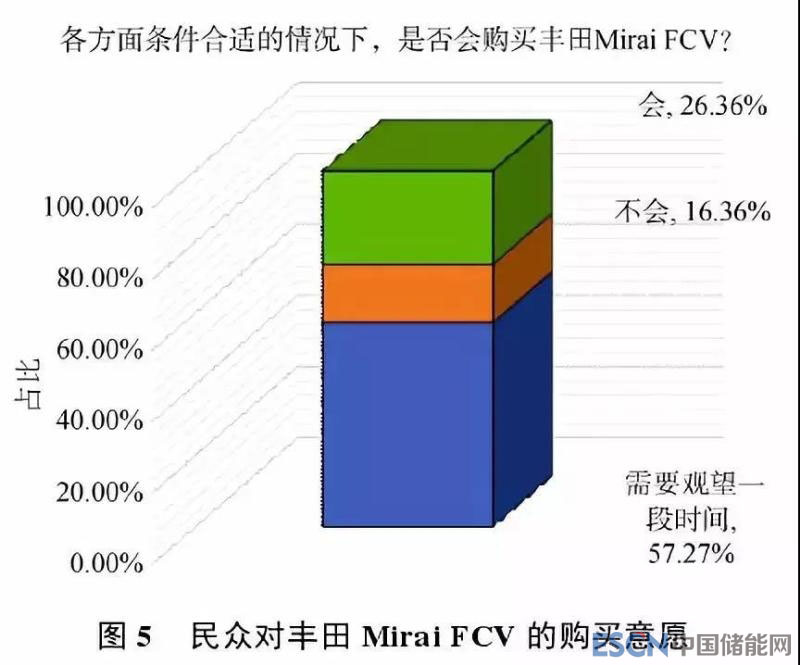 產業(yè)模式上,應該做好中長期的產業(yè)布局,目前可以讓燃料電池商用車做好示范運行,再逐漸把燃料電池技術推廣和應用至乘用車上。成本的降低不僅依靠技術的進步,還有賴于規(guī)模化生產。目前,中國生產的燃料電池組成本需10000美元/kW,日本生產的燃料電池組成本也需2000美元/kW,美國能源局經過測算認為只有當燃料電池的成本降至50美元/kW時,才能與內燃機汽車形成競爭。通過《調查》還發(fā)現(xiàn),以中國目前的消費水平,有61.82%的人能接受的氫燃料電池汽車的價格都在10?20萬這個區(qū)間(如圖4),參照豐田Mirai現(xiàn)在30萬元左右的售價,顯然FCV的價格還不能引起人們的購買欲望(從圖5有57.27%的人持觀望態(tài)度也可以看出),反映出來的問題便是氫燃料電池的成本還有極大的下降空間。