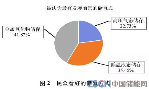 固態(tài)吸氫材料儲氫是利用某些金屬絡合物來吸附氫氣的。研究發(fā)現(xiàn),把鎂、鈦、鋯、鈮、鑭等金屬及它們的合金制成絡合物,再將它們置于高壓(<5MPa)的氫氣環(huán)境中,這些金屬就會像海綿吸水一樣把氫氣儲存起來,只需通過加熱或減壓的方式就能讓它們把氫氣釋放出來。金屬氫化物單位體積的儲氫密度是相同溫度、壓力條件下氣態(tài)氫的1000倍,儲氫能力優(yōu)于氣態(tài)儲氫和液態(tài)儲氫。在《調查》中(見圖2),約有42%的人認為"金屬氫化物儲存"是最有發(fā)展前景的車載儲氫方式(占比最大),可見該儲氫方式的確是最符合汽車的使用要求的。