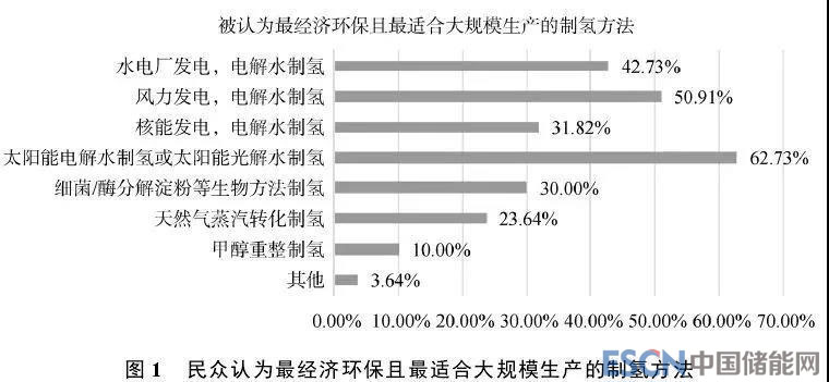 作者進行了《關于氫能源汽車的技術認知及發(fā)展前景調查》(以下全部簡稱為《調查》)的調查報告,報告中對于"你認為最經濟環(huán)保且最適合大規(guī)模生產的制氫方法是什么?”(如圖1),有62.73%的人認為是"太陽能電解水制氫或太陽能光解水制氫”,占比最高;其次是"風力發(fā)電,電解水制氫”,占比50.91%,該兩項數(shù)據(jù)也可以充分說明人們對風電制氫和太陽能發(fā)電制氫的期望和科學的制氫方式是相吻合的。