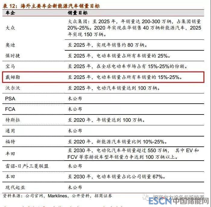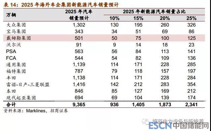 2025年海外車企新能源車當(dāng)年銷量預(yù)計(jì)達(dá)1400萬輛以上:2012-2017年,海外12大車企集團(tuán)(不包含特斯拉)所有整車銷量CAGR約2.6%。假設(shè)該復(fù)合增速為2017-2025年的增速,對(duì)應(yīng)2025年銷量為9365萬輛。我們分別假設(shè)2025年12大車企集團(tuán)新能源汽車(EV+PHEV)滲透率為10%、15%、20%、25%,分別對(duì)應(yīng)936、1405、1873、2341萬輛的當(dāng)年銷量。中性預(yù)測(cè)2025年海外12大車企的新能源汽車銷量有望達(dá)到1400-1900萬輛。