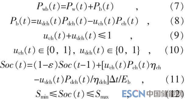 式中: Pw(t)為 t時刻風(fēng)電出力; Pch(t)為 t時刻儲能電池的充電功率;Pdch(t)為t時刻儲能電池的放電功率; uch(t)和 udch(t)分別表示儲能電池 t時刻的充、 放電狀態(tài), uch(t)=1 和 udch(t)=1 分別表示儲能電站t時刻處于充電和放電狀態(tài);Soc(t)為t時刻的電池荷電狀態(tài);ε為電池自放電率;ηch和ηdch分別為儲能電池的充、放電效率;Smax和Smin分別為儲能電池荷電狀態(tài)的允許上、下限值。