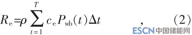 式中:ce為考慮國家補(bǔ)貼的風(fēng)儲聯(lián)合系統(tǒng)上網(wǎng)電價;Pwb(t)為風(fēng)儲聯(lián)合系統(tǒng)在時段t的輸出功率;ρ為一年中風(fēng)儲聯(lián)合系統(tǒng)運(yùn)行的天數(shù);Δt為1個采樣時段。