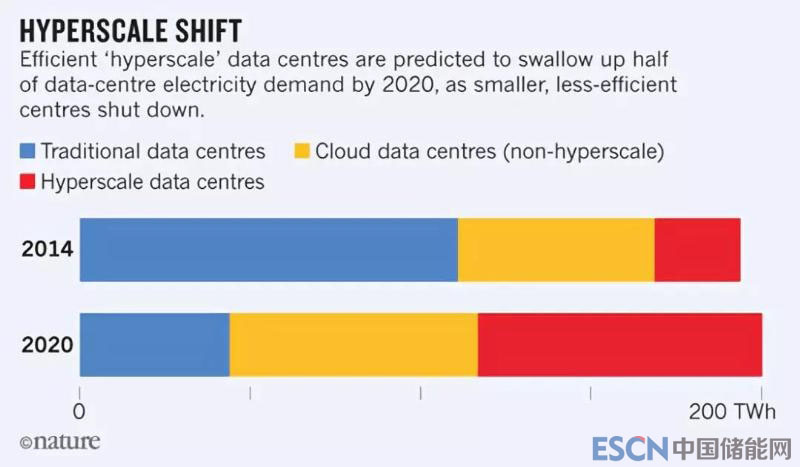 今天,全世界有大約400個(gè)超大規(guī)模數(shù)據(jù)中心,其中許多數(shù)據(jù)中心為小型企業(yè)或大學(xué)提供服務(wù),而這些企業(yè)在過去曾擁有自己的服務(wù)器?,F(xiàn)在這些企業(yè)的用電消耗已經(jīng)占據(jù)全球數(shù)據(jù)中心用電量的20%。 IEA表示,到2020年,超大規(guī)模中心將占其中的近一半(參見下圖“超大規(guī)模的轉(zhuǎn)變”)。