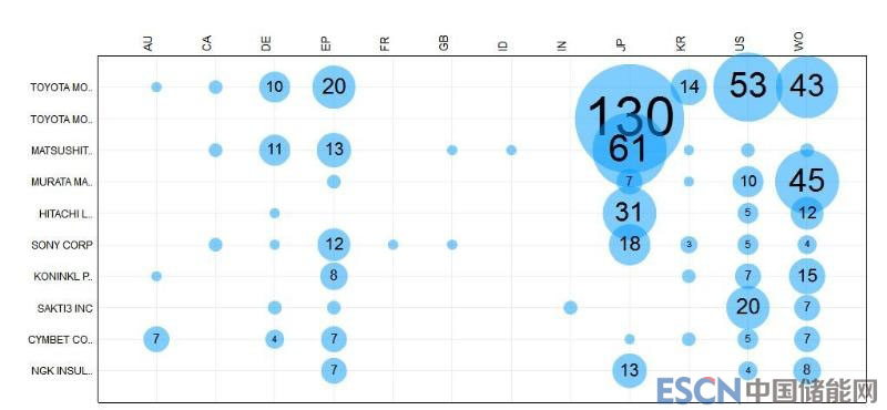 通過國(guó)外專利的年度申請(qǐng)量情況我們可以分析國(guó)際上對(duì)固態(tài)電池的研發(fā)趨勢(shì)。國(guó)外關(guān)于固態(tài)電池的研究要比國(guó)內(nèi)起步早,但前期專利申請(qǐng)量不高。整體上也呈現(xiàn)申請(qǐng)量逐年增加的趨勢(shì)。且從2010年開始有較大幅度的增加,與之對(duì)應(yīng)的是豐田、Sakti3、蘋果等都宣布或推出與固態(tài)電池相關(guān)的產(chǎn)品或研發(fā)應(yīng)用。由圖可以看出,近幾年關(guān)于專利申請(qǐng)量有所下降,原因可能有2方面:一是全球范圍內(nèi)固態(tài)電池技術(shù)研發(fā)熱度有所下降,部分國(guó)家的研發(fā)團(tuán)隊(duì)退出固態(tài)電池技術(shù)舞臺(tái),導(dǎo)致專利數(shù)量下滑;二是技術(shù)從研發(fā)到申請(qǐng)專利再到專利公開并錄入數(shù)據(jù)庫(kù),一般有十幾個(gè)月的滯后,那么近兩年的專利數(shù)量會(huì)受此影響,導(dǎo)致檢索到的專利數(shù)量較實(shí)際情況偏少。