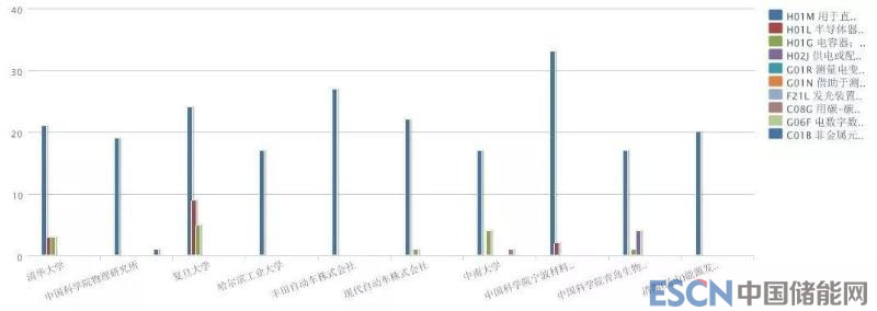 專利申請(qǐng)量靠前的幾家企業(yè)和科研院所的研究方向大多集中在H01M這一小類上,其中中科院寧波所在該小類上的專利申請(qǐng)量最多;另外清華大學(xué)和復(fù)旦大學(xué)等高校還涉及H01L和H01G小類上的研發(fā),而對(duì)于豐田和本田等車企則幾乎全部集中在H01M小類上。