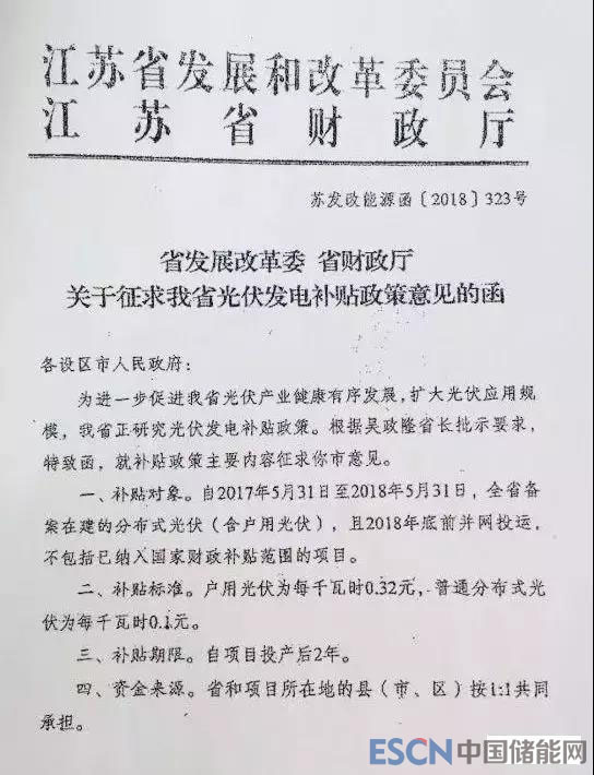 江蘇省兩部門發(fā)布了《關(guān)于征求我省光伏發(fā)電補(bǔ)貼政策意見的函》,2018年底前并網(wǎng)的項(xiàng)目,戶用光伏的補(bǔ)貼標(biāo)準(zhǔn)0.32元/kWh,普通分布式光伏補(bǔ)貼為0.1元/kWh,連續(xù)補(bǔ)貼兩年。但尚未看到該文件的正式稿。