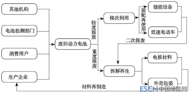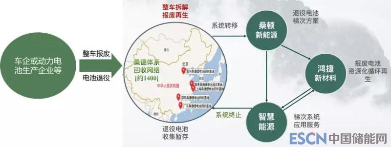 高度協(xié)同的梯次利用及再生產(chǎn)業(yè),包含收集網(wǎng)絡(luò)、梯次利用、梯次應(yīng)用、循環(huán)再生4個環(huán)節(jié),以整車報廢、電池退役為可服務(wù)對象,流程如下: