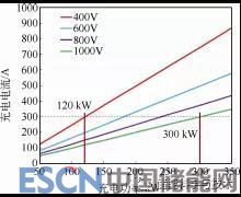 鑒于電壓和電流較高,優(yōu)化的電池組設(shè)計(jì)對(duì)于實(shí)現(xiàn)XFC至關(guān)重要。現(xiàn)有大多數(shù)電動(dòng)汽車電池組的額定電壓等于或低于400 V,這意味著極快速充電過(guò)程中的最大額定電流高達(dá)300 A。圖2顯示了不同電池組電壓時(shí)充電電流與充電功率間的關(guān)系。較高的電流會(huì)產(chǎn)生更多的熱量,這將增加電池組冷卻系統(tǒng)的熱負(fù)荷。還需要更堅(jiān)固的母線、極耳、集流體、熔斷器、斷開(kāi)開(kāi)關(guān)和絕緣,以適應(yīng)更高的電流,從而增加了電池組的質(zhì)量和成本。充電樁設(shè)備也必須適應(yīng)更高的電流,也帶來(lái)成本和質(zhì)量的增加。從圖2中可以明顯地看出,如果統(tǒng)一采用300 A電流,400 V系統(tǒng)只能支撐120 kW的充電功率,而1000 V系統(tǒng)可以實(shí)現(xiàn)300 kW的充電功率。因此,不斷提高系統(tǒng)電壓是動(dòng)力電池組設(shè)計(jì)的發(fā)展趨勢(shì),以期實(shí)現(xiàn)1000 V的電池組系統(tǒng)。