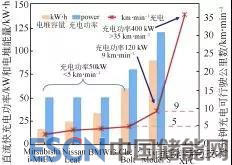 快速充電能力不僅可以用功率作為參數(shù),也可以用每分鐘充電獲得的行程里程數(shù)來(lái)定義。假設(shè)電動(dòng)車的能耗為177 W·h/km,圖1比較了各種電動(dòng)車以標(biāo)稱直流快充功率充電時(shí)每分鐘可以實(shí)現(xiàn)的續(xù)駛里程,并與XFC模式的數(shù)據(jù)進(jìn)行了比較。由圖可知,大多數(shù)電動(dòng)汽車的充電能力低于5 km/min,而特斯拉最先進(jìn)的120 kW超級(jí)充電模式達(dá)到9 km/min,但即便如此,距離XFC的高于35 km/min的指標(biāo)還是相距甚遠(yuǎn)。