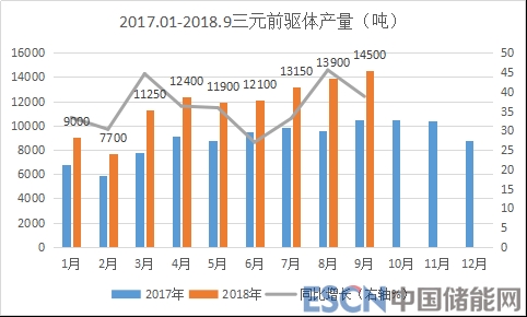 1-9月份三元前驅(qū)體統(tǒng)計(jì)產(chǎn)量10.59萬(wàn)噸,同比增長(zhǎng)36.3%;