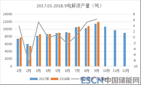 1-9月份電解液統(tǒng)計(jì)產(chǎn)量8.19萬(wàn)噸,同比增長(zhǎng)1.5%,其中下半年表現(xiàn)明顯強(qiáng)于上半年;