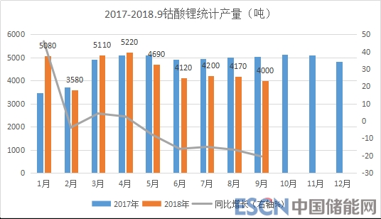 1-9月份鈷酸鋰統(tǒng)計(jì)產(chǎn)量4.02萬(wàn)噸,同比下滑1.1%,4月份以來(lái)產(chǎn)量出現(xiàn)明顯下滑,數(shù)碼電池需求疲軟較明顯;
