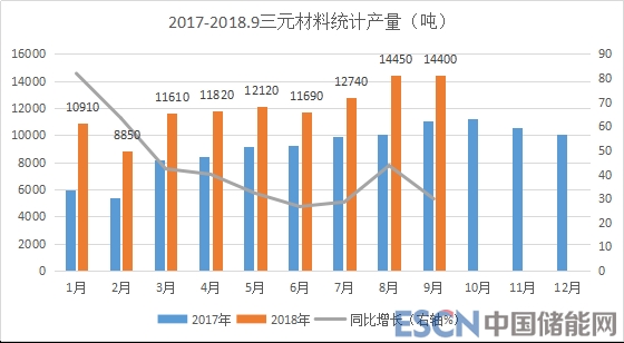 1-9月份三元材料統(tǒng)計(jì)產(chǎn)量10.86萬(wàn)噸,同比增長(zhǎng)40%,現(xiàn)月產(chǎn)量穩(wěn)定在1.4萬(wàn)噸以上;