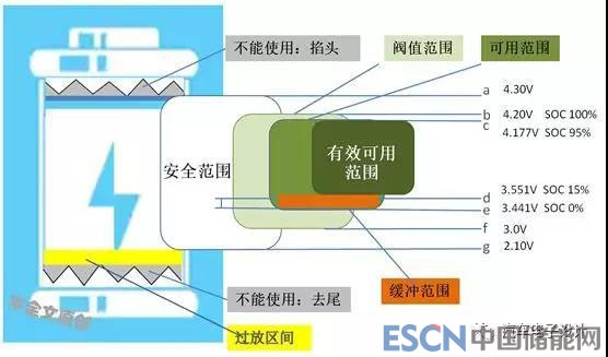 附圖一,借用全球知名品牌電池參數(shù)示意,SOC范圍、 SOC可用范圍,電池閥值范圍、安全范圍之間的包含關(guān)系。