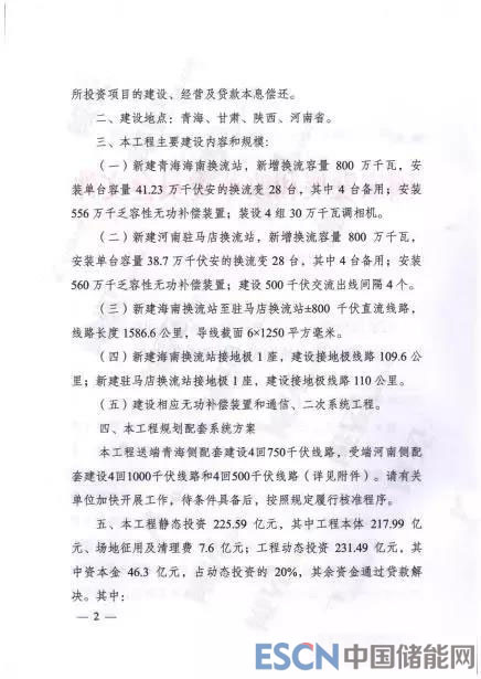 (二)新建河南駐馬店換流站,新增換流容量800萬千瓦;安裝單臺容量38.7萬千伏安的換流變28臺,其中4臺備用;安裝560萬千乏容性無功補償裝里;建設500千伏交流出線間隔4個。