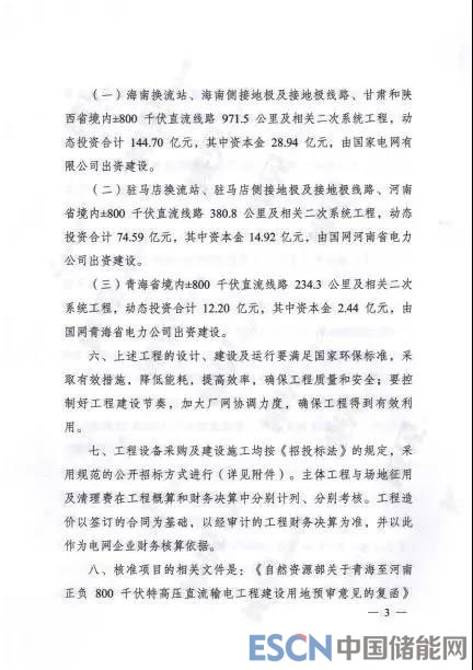 (三)新建海南換流站至駐馬店換流站士800千伏直流線路,線路長度1586.6公里,導線截面6X1250平方毫米。