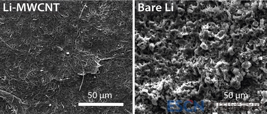 萊斯大學(xué)研究人員進(jìn)行500次充放電循環(huán)后,金屬鋰陽極的形貌如圖所示,左圖電極有一層碳納米管阻止著枝晶的生長。右圖是無保護(hù)的金屬鋰陽極中出枝晶生長的形貌