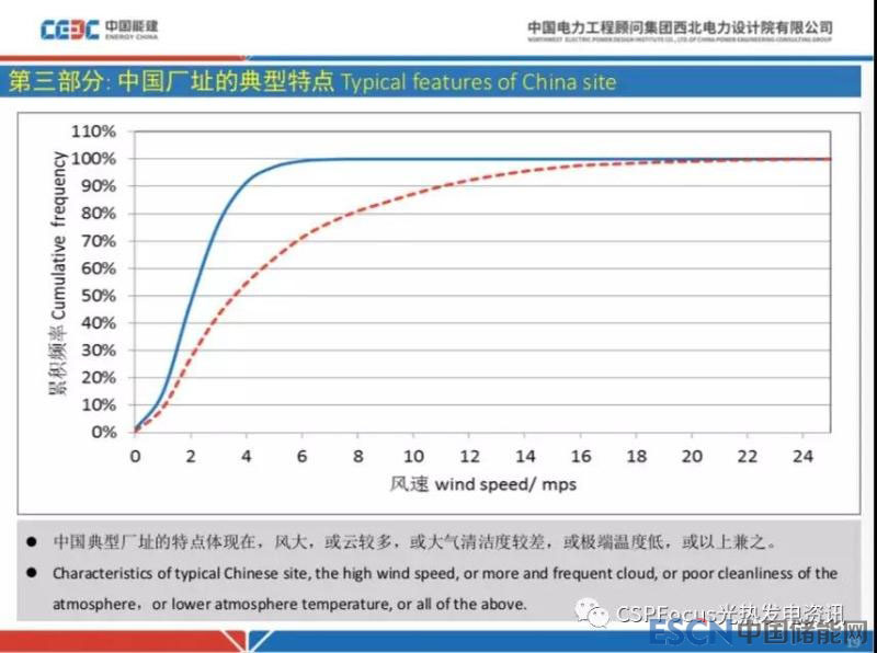 最后再強調(diào)一下風(fēng)的問題,風(fēng)大的話集熱器設(shè)計成本比較高,比如上面這一組曲線,橫坐標是風(fēng)速,縱坐標是風(fēng)速累積頻率結(jié)果,兩個曲線代表兩個廠址。比如這個電站集熱器要確保99%的風(fēng)速下都可以工作,如果是紅色間斷線代表的廠址,那么這個地區(qū)風(fēng)比較大,會發(fā)現(xiàn)集熱器抗風(fēng)要求比較高,可能到15m/s或者更高,這里的風(fēng)速是10米高的平均風(fēng)速,跟外國常說的3s陣風(fēng)的不太一樣,這里有個既定的轉(zhuǎn)化關(guān)系。而對于藍色實線代表的廠址,累積概率99%時對應(yīng)的風(fēng)大部分情況下都是6m/s以內(nèi),集熱器前期投資可以控制在比較低的水平。