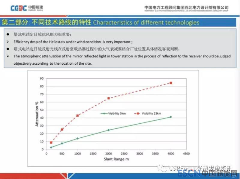 塔式電站有什么需要我們特別關(guān)注的問題呢,就是在項目選擇的時候,我想有兩個關(guān)鍵因素需要提醒。一個是抗風(fēng)能力,因為新疆哈密有一些地區(qū)風(fēng)非常大,塔式電站定日鏡誤差,包括運行中隨著不同的風(fēng)速,風(fēng)速越高誤差越大,會非常明顯的增大,導(dǎo)致性能下降。還有一個問題,大氣清潔度問題,比方說這跟實線是5公里的可見度模型和虛線23公里可見度模型,橫坐標是定日鏡距離吸熱器的距離,縱坐標是大氣衰減量,比如說100兆瓦的電站,最遠的定日鏡距離吸熱器可能會到2000米,這里比較清潔的大氣條件模型下,反射鏡到吸熱器能量傳輸過程中,能量損失20%多。更糟糕的情況下是某個廠址某個季節(jié),或者全年空氣臟兮兮的,沙塵霧比較多就會更夸張,當然實際中沒有這么夸張的清潔度,但是還是很重要的一個因素在選址的時候需要重視。日喀則大氣環(huán)境和德令哈、敦煌、玉門都不一樣,選擇的時候也是需要重視。