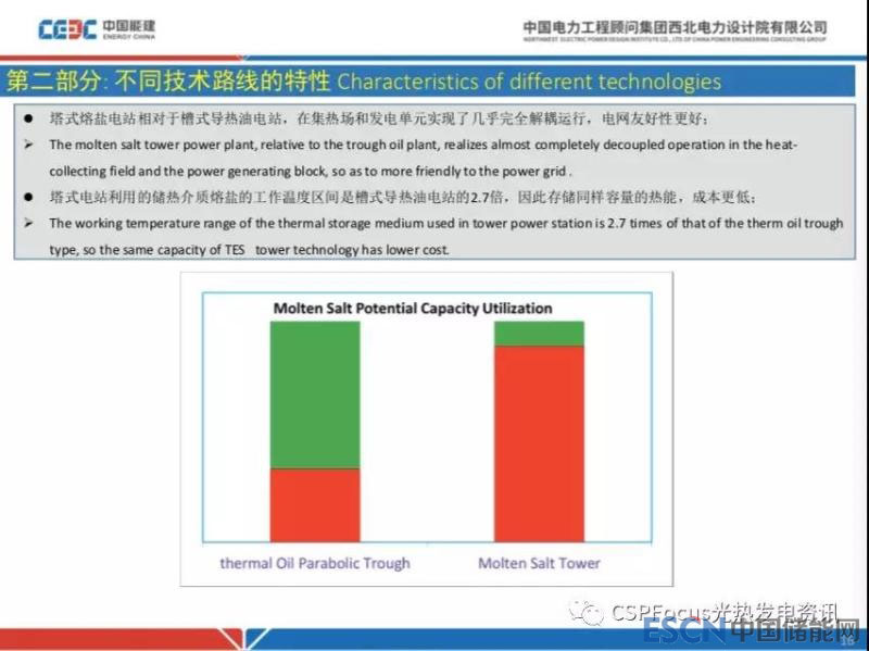 槽式和塔式都采用熔鹽作為儲熱介質(zhì),對于槽式電站溫度比較低,假設(shè)這根柱子高度代表熔融鹽總共儲能的能力(低溫不是按熔鹽凝固點,是按照朗肯循環(huán)回?zé)嵯到y(tǒng)決定的,大概290度),紅色代表熔融鹽儲能能力的利用情況,槽式只利用了33%,塔式熔鹽電站利用了90%,我們在393度的槽式電站中采用熔鹽儲鹽,并沒有把熔鹽儲能更充分利用。為什么強度熔鹽這個問題呢?我們知道國內(nèi)有一些項目,近年熔鹽成本高于前些年廣核德令哈項目招標價30%,對100兆瓦的導(dǎo)熱油電站來說,這部分成本可能在2個多億,這就是一個比較致命的投資了。這么貴的東西要充分利用它才能更好地發(fā)覺其價值。