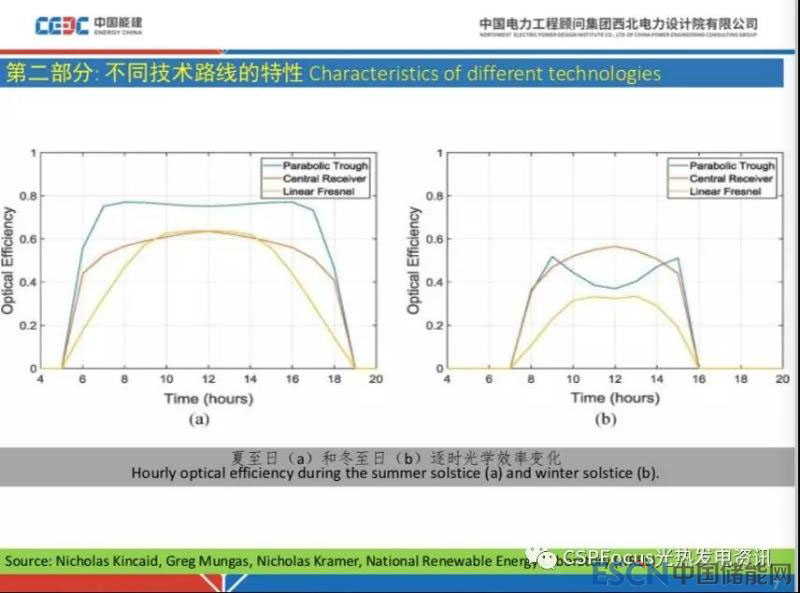 首先,上一組圖橫坐標是某一天時刻數(shù),縱坐標是不同技術(shù)路線光學(xué)效率,左邊的圖是夏至日曲線,右邊的圖是冬至日曲線,藍色是槽式,中間橙色是塔式,黃色是菲涅爾。這組曲線地理位置在北緯36度,跟西安差不多的地方,夏季槽式電站光到熱是很關(guān)鍵的步驟,由圖可見,槽式具有比較明顯的更為優(yōu)越的光學(xué)效率,相應(yīng)的塔式電站低一些,菲涅爾一天當中隨著時間推移效率變化是比較明顯的,就是表現(xiàn)為曲線的峰在時間維度比較窄,不像槽式和塔式很快可以達到較高效率,且能維持在較高效率環(huán)節(jié)較長時間。