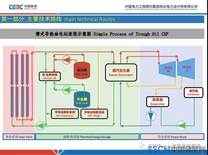 最為成熟的槽式導(dǎo)熱油帶儲熱電站,集熱場加熱后的導(dǎo)熱油溫度不是很高。大概290度導(dǎo)熱油進集熱場之后經(jīng)過集熱器加熱到大概390度,首先優(yōu)先進入到蒸汽發(fā)生器和水換熱產(chǎn)生蒸汽,驅(qū)動汽輪機發(fā)電。當集熱場產(chǎn)生的熱功率大于汽輪機所需要的功率時候,多余的能量進儲換熱單元的油鹽換熱器,存儲在熔鹽中。熔鹽儲熱的時候冷的熔鹽通過低溫熔鹽泵循環(huán)吸熱,存儲在熱鹽罐里面,當夜間的時候熱熔鹽通過高溫熔鹽泵,在同樣一個換熱器里面將熱量傳給導(dǎo)熱油,導(dǎo)熱油再把熱量傳輸給蒸汽發(fā)生器里面的水,以產(chǎn)生蒸汽來發(fā)電。