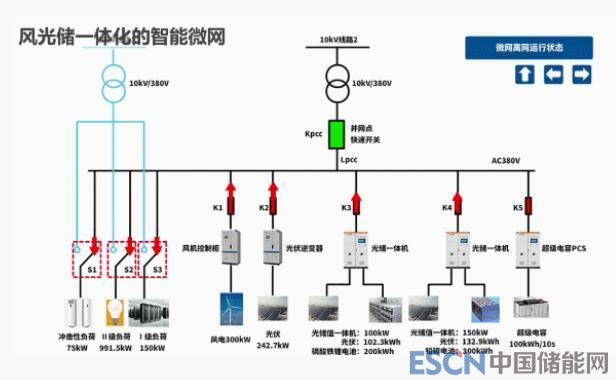 為了確保在外部供電系統(tǒng)失電的情況下,微電網(wǎng)能夠繼續(xù)保證信息中心機(jī)房重要負(fù)荷和2棟建筑部分普通負(fù)荷供電的需求,系統(tǒng)還配置有容量為100千瓦×2小時(shí)的磷酸鐵鋰電池、150千瓦×2小時(shí)的鉛炭電池和100千瓦×10秒的超級電容儲能設(shè)備。三種儲能設(shè)備與學(xué)校的不間斷電源相連,一并接入微網(wǎng)系統(tǒng)。