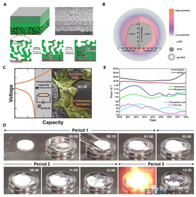 通常我們認(rèn)為固態(tài)電解質(zhì)的安全性是其一大優(yōu)勢(shì),特別是氧化物固態(tài)電解質(zhì)不具有可燃性,因此安全性要遠(yuǎn)遠(yuǎn)好于傳統(tǒng)的碳酸酯類電解液,但是Chung和Kang等人研究卻發(fā)現(xiàn)即便是全固態(tài)電池也存在熱失控的風(fēng)險(xiǎn)。首先他們將Li1.5Al0.5Ge1.5(PO4)3固態(tài)電解質(zhì)(熔點(diǎn)超過(guò)1100℃)壓成片,然后放入到熔化的金屬鋰(熔點(diǎn)180℃)之中(如下圖D所示),固態(tài)電解質(zhì)片首先會(huì)漂浮在金屬鋰的表面,然后固態(tài)電解質(zhì)片開(kāi)始發(fā)生破碎和粉化,最后發(fā)生了熱失控。因此全固態(tài)電池固然安全性要好于碳酸酯類電解液,但是全固態(tài)電池仍然存在熱失控的風(fēng)險(xiǎn),在全固態(tài)電池的設(shè)計(jì)和應(yīng)用中也需要充分考慮熱失控的風(fēng)險(xiǎn)。