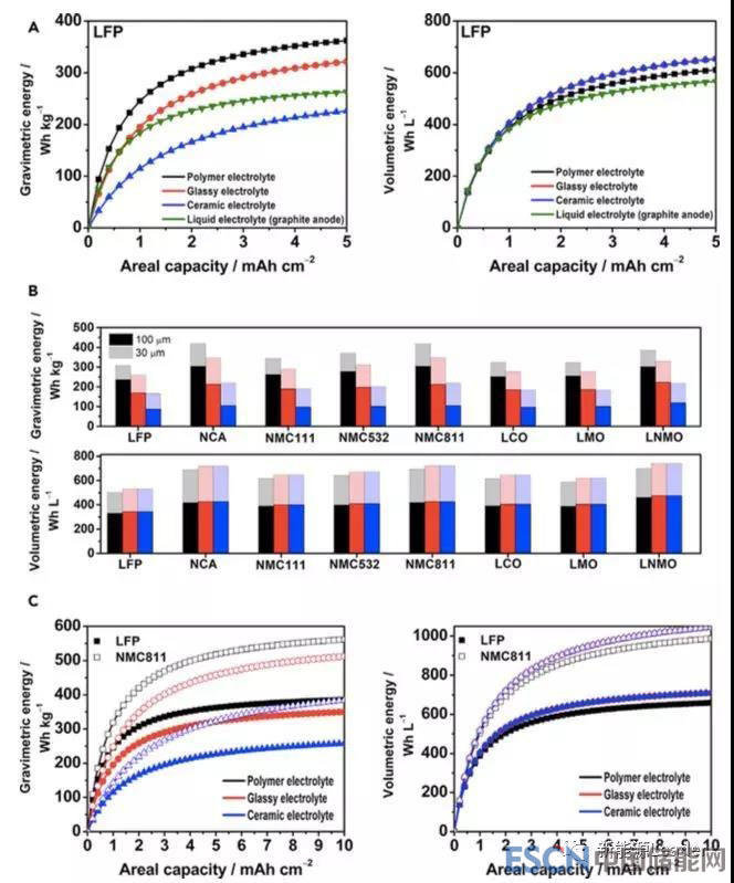 從下圖c我們能夠看到,NCM811材料是提升電池能量密度達(dá)到500Wh/kg以上,體積能量密度700Wh/L以上的關(guān)鍵,此外適當(dāng)提升金屬鋰的負(fù)載量到4mAh/cm2也能有效提升電池能量密度,但是繼續(xù)提升負(fù)載量對(duì)于提升鋰離子電池能量密度的效果就不明顯了(注意這些數(shù)據(jù)都是在固態(tài)電解質(zhì)厚度在30um的前提下計(jì)算得到的)。