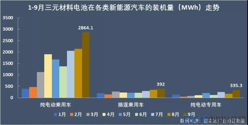 不過(guò),同期累計(jì)相比,去年前9個(gè)月三元材料電池的裝機(jī)比重僅為49.52%,今年三元材料電池裝機(jī)量的高比重系商用車(chē)市場(chǎng)總體不景氣、磷酸鐵鋰電池大戶(hù)純電動(dòng)客車(chē)的產(chǎn)量一直低迷所致。