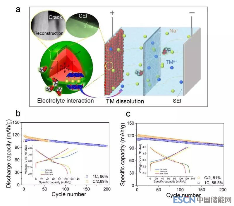 電子商品市場(chǎng)對(duì)質(zhì)優(yōu)價(jià)廉的電池的持續(xù)需求促進(jìn)了低成本鈉離子電池的發(fā)展。具有層狀結(jié)構(gòu)的鈉離子電池正極材料由于其合成簡(jiǎn)單,鈉離子容量較高,且過(guò)渡金屬元素帶來(lái)的不同電化學(xué)性質(zhì)而倍受青睞。然而層狀正極氧化物材料的壽命短、長(zhǎng)時(shí)間充-放電循環(huán)穩(wěn)定性較差的缺點(diǎn)直接影響了鈉離子電池的大規(guī)模產(chǎn)業(yè)化進(jìn)程。先前的研究揭示了層狀正極材料自身在充-放電循環(huán)過(guò)程中的不可逆相轉(zhuǎn)變是導(dǎo)致其性能衰減的主要原因。因此,很多研究都著力于如何抑制電極材料的相轉(zhuǎn)變過(guò)程。目前鋰離子電池層狀正極材料的界面電子結(jié)構(gòu)和化學(xué)成分的演化已被公認(rèn)為是影響電池性能的重要因素。然而鈉離子電池層狀正極材料的表面結(jié)構(gòu)轉(zhuǎn)變、性能衰減與液體電解質(zhì)界面化學(xué)是否相關(guān)卻鮮有觸及。