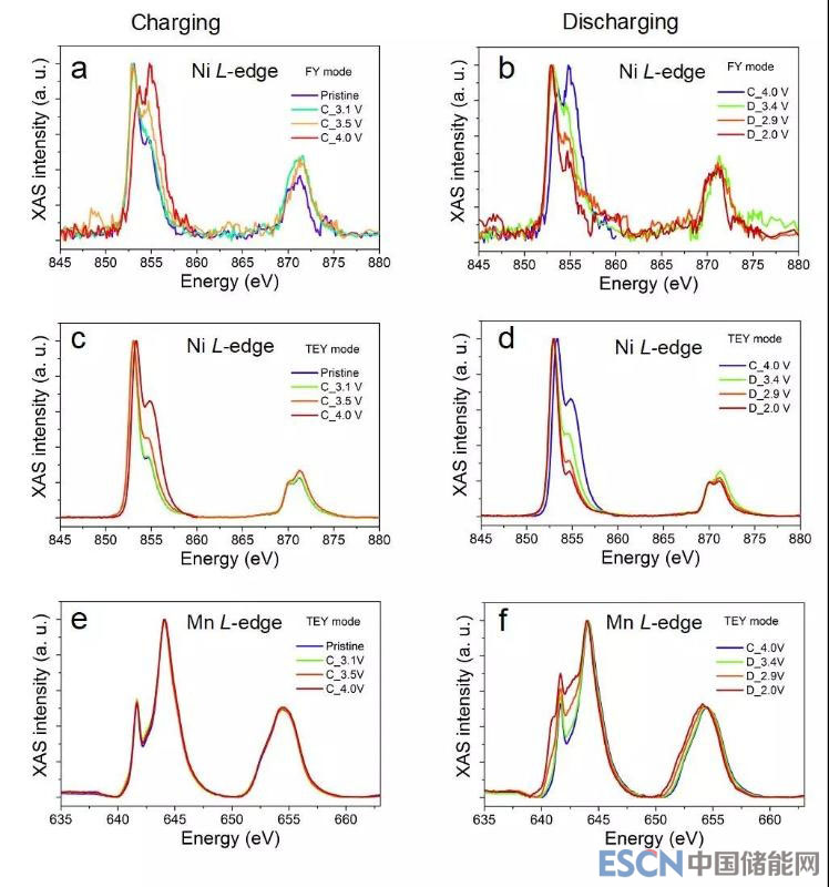 為了進(jìn)一步的研究正極顆粒表面的化學(xué)狀態(tài)的變化,作者通過(guò)軟X射線吸收譜(XAS)表征了電極表面各個(gè)元素的變化規(guī)律。TEY(Total Electron Yield)模式主要探測(cè)顆粒表面10 nm深度,而FY(Fluorescence Yield)模式測(cè)試深度可達(dá)50 nm。由于鎳元素在電池充電過(guò)程主要參與了電荷補(bǔ)償,所以Ni L-edge譜圖在FY模式下表現(xiàn)出逐漸被氧化到高價(jià)態(tài)的趨勢(shì)。然而Ni L-edge在FY模式所得結(jié)果與TEY模式中的譜圖大相徑庭:在各個(gè)充放電深度下, 位于表面的Ni價(jià)態(tài)均明顯低于體相。而表面鎳元素被還原的過(guò)程中,電解液同時(shí)會(huì)被氧化,這可能是導(dǎo)致電池庫(kù)倫效率不高的原因之一。有趣的是,在充電過(guò)程中,錳元素在正極顆粒表面始終保持+4價(jià)。放電過(guò)程中,當(dāng)電壓低于2.9 V時(shí),錳元素開(kāi)始被還原。以上實(shí)驗(yàn)所觀察到的現(xiàn)象可能與之前觀察到的表面重構(gòu)或是過(guò)渡金屬?gòu)恼龢O溶解并沉積到其表面有關(guān)。