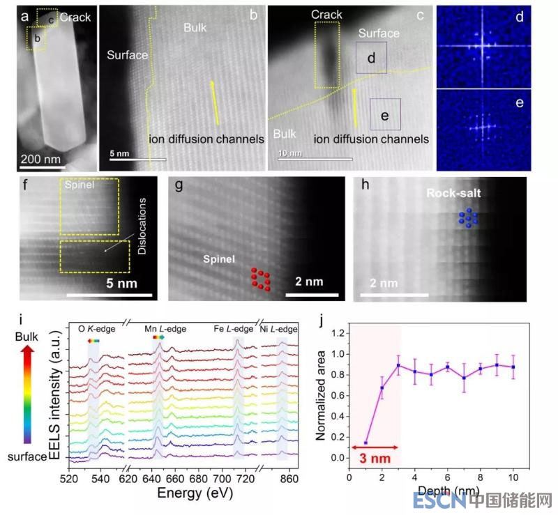 (a-c,f-h)正極材料循環(huán)一周后掃描透射電鏡圖像;