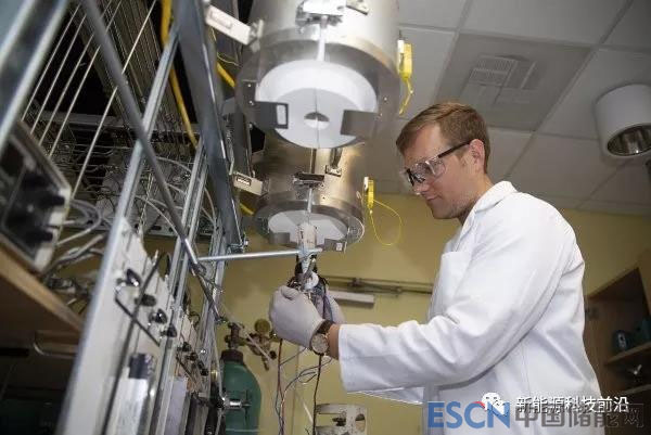研究生助理Ben deGlee將電極連接到一個測試單元,用于測試位于佐治亞理工學院的Meilin Liu實驗室的新燃料電池。圖片來源:Georgia Tech / Christopher Moore