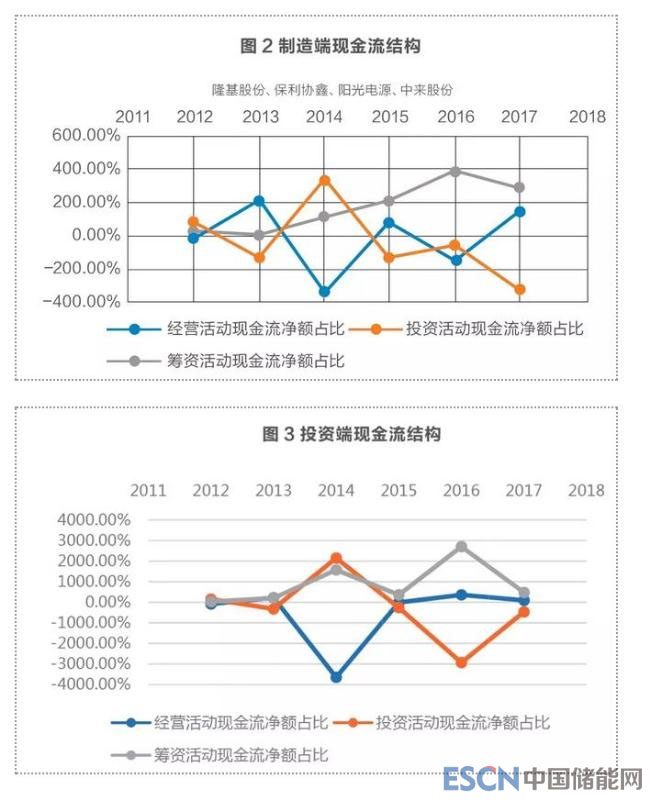 進(jìn)一步分析各企業(yè)的現(xiàn)金流結(jié)構(gòu),圖2和圖3所示分別為制造端與投資端企業(yè)的經(jīng)營(yíng)、投資和籌資所獲現(xiàn)金流占比現(xiàn)金及現(xiàn)金等價(jià)物凈增加額情況(平均值);2012年歐美出臺(tái)雙反政策導(dǎo)致國(guó)外市場(chǎng)萎縮,全行業(yè)營(yíng)收大幅下滑,經(jīng)營(yíng)現(xiàn)金流不足,各公司的基本運(yùn)行主要通過(guò)籌資來(lái)維持,投資活動(dòng)減弱。2013年起得益于國(guó)內(nèi)光伏利好政策支持,2014和2016年投資端和制造端投資活動(dòng)積極,全產(chǎn)業(yè)呈現(xiàn)擴(kuò)張的態(tài)勢(shì)(圖2,圖3)。