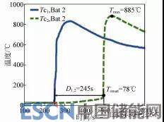 FENG等針對(duì)6節(jié)25 A·h三元鋰離子電池組成的串聯(lián)模塊,進(jìn)行了針刺觸發(fā)的熱失控實(shí)驗(yàn),進(jìn)而對(duì)熱失控蔓延機(jī)理做了分析。當(dāng)方殼型電池發(fā)生熱失控時(shí),通過(guò)電池正面接觸而產(chǎn)生的側(cè)向加熱非常劇烈,導(dǎo)致被加熱電池內(nèi)部在厚度方向上溫度梯度很大,熱失控蔓延的發(fā)生是由于電池前端面溫度達(dá)到熱失控觸發(fā)溫度來(lái)判定,見(jiàn)圖2。