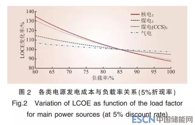 電源的LCOE受其負(fù)載率影響很大,這種影響程度隨著總成本中燃料成本和排放成本的比例變化而變化。最近的IEA/NEA研究報(bào)告分析了各主要電源的總發(fā)電成本構(gòu)成,如表3所示。對(duì)核電而言,由于其成本構(gòu)成主要是投資成本,燃料成本通常不超過總成本的20%,無碳排放成本,因此當(dāng)核電參與系統(tǒng)調(diào)峰時(shí),由負(fù)載率下降(年發(fā)電量等比例減少)引起的LCOE變化相較其他電源更大。根據(jù)2010年國際原子能機(jī)構(gòu)數(shù)據(jù),在折現(xiàn)率5%的情況下,負(fù)載率由90%降至70%時(shí),核電LCOE上升約35%,遠(yuǎn)高于煤電的10%和氣電的7%(如圖2所示)。