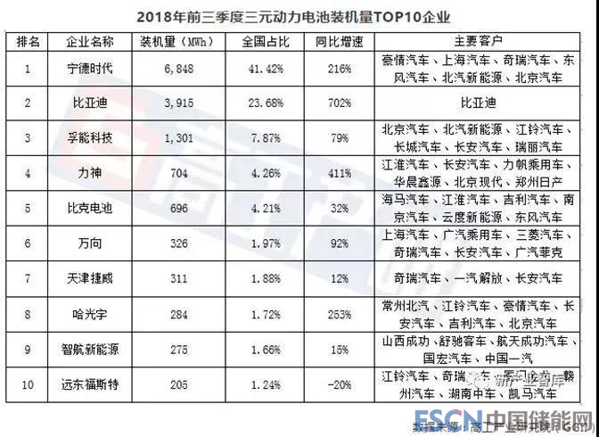 GGII統(tǒng)計,2018年前三季度三元動力電池裝機總量排行榜中,進入前十的企業(yè)有寧德時代、比亞迪、孚能科技、力神、比克電池、萬向、天津捷威、哈光宇、智航新能源、遠東福斯特。其中,排名前三的企業(yè)合計市占比達到72.97%,前十家企業(yè)總計市占比已經(jīng)達到89.91%,接近九成。