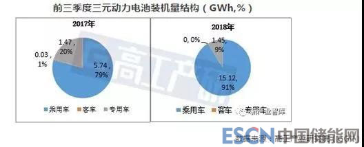 GGII數(shù)據(jù)顯示,在三元動力電池下游終端結構中,2018年前三季度乘用車裝機量占比91%,較去年同期占比上升12個百分點。