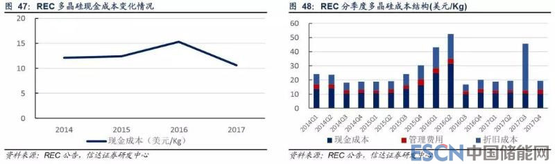 REC 采用流化床工藝生產(chǎn)多晶硅,從其成本結(jié)構(gòu)中可明顯看出與西門子法的區(qū)別,西門子法折舊成本占總成本的比重一般不超過 25%,而 REC 生產(chǎn)成本中折舊成本占比超 30%。2016 年其摩西湖基地在 2-5 月停產(chǎn),導(dǎo)致成本迅速提高。而且從全球來看,REC 整體成本較高,競爭力相對不足。其 2017 年也提出減少太陽能級多晶硅生產(chǎn),加大電子級多晶硅業(yè)務(wù)布局的規(guī)劃。