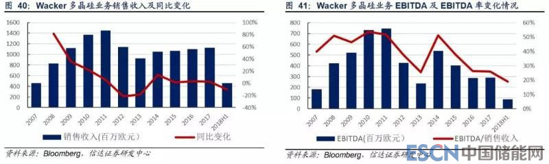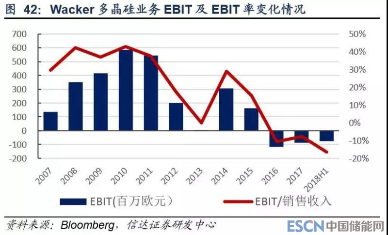 從業(yè)績來看,瓦克近年來多晶硅營收相對穩(wěn)定,但利潤水平下滑幅度明顯。其息稅折舊攤銷前凈利潤/營收從 2014 年的 50% 下降至 2018 年上半年的不足 20%,2016 年以來息稅前利潤均為負值。我們認為,瓦克在德國的多晶硅產(chǎn)能投產(chǎn)較早,成本 方面存在一定劣勢;同時其美國產(chǎn)能仍有一定的不穩(wěn)定性,2017 年就因技術(shù)缺陷發(fā)生氫氣爆炸,影響了約 0.6 萬噸多晶硅生 產(chǎn),加之我國對美多晶硅“雙反”貿(mào)易關(guān)稅較高,我們認為瓦克在國內(nèi)市占率有下滑預(yù)期。