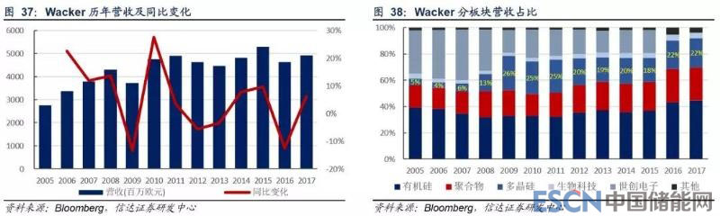 瓦克是一家在硅和乙烯化學(xué)領(lǐng)域具有國際領(lǐng)先水平的跨國企業(yè),當前業(yè)務(wù)板塊包括有機硅、聚合物、多晶硅和生物科技等,并在有機硅、多晶硅及聚合物板塊中的乳膠粉和 VAE 共聚乳液等領(lǐng)域占據(jù)全球龍頭地位。近年來多晶硅板塊占公司整體營收 的比重在 20%左右。