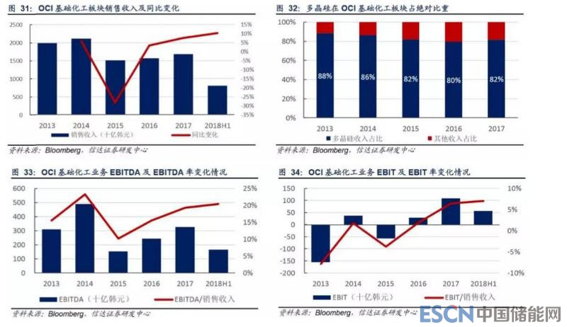 由于 OCI 未單獨披露多晶硅業(yè)務(wù)經(jīng)營情況,但多晶硅業(yè)務(wù)營收在整體基礎(chǔ)化工板塊中占比很高,我們認為基礎(chǔ)化工板塊業(yè)績 可以反映其多晶硅業(yè)務(wù)業(yè)績水平。2015 年,受多晶硅價格下跌以及群山 P2 工廠發(fā)生氯化硅氣體泄漏事故,停產(chǎn)兩個月導(dǎo)致 產(chǎn)量同比減少 15%以上影響,OCI 基礎(chǔ)化工板塊業(yè)績大幅下滑。2016-2017 年,隨著擴產(chǎn)及收購產(chǎn)能釋放帶來的銷量增長、 成本下降及多晶硅價格回升,其基礎(chǔ)化工板塊業(yè)績持續(xù)好轉(zhuǎn)。