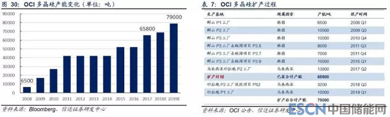 2017 年 5 月,OCI 出資 1.73 億美元收購日本德山位于馬來西亞砂拉越的多晶硅工廠,截至 2017 年底,該工廠產(chǎn)能為 1.38 萬噸,其整體產(chǎn)能提升至 6.58 萬噸,預(yù)計砂拉越工廠兩個擴產(chǎn)項目將分別于 2018Q3 和 2019 投產(chǎn),投產(chǎn)后 OCI 總產(chǎn)能將達 7.9 萬噸。未來,OCI 兩大生產(chǎn)基地中,韓國工廠定位高質(zhì)量的單晶及半導(dǎo)體用多晶硅生產(chǎn),馬來西亞工廠定位提供有成本優(yōu) 勢的單晶和高效多晶用多晶硅生產(chǎn)。
