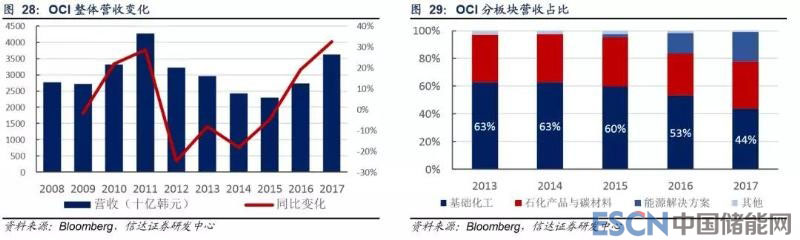 OCI 為韓國企業(yè),成立于 1959 年,從化工業(yè)務(wù)起家。目前已形成基礎(chǔ)化工、石化產(chǎn)品與碳材料、能源解決方案三大業(yè)務(wù)板塊。 其中多晶硅產(chǎn)品屬基礎(chǔ)化工板塊;同時 OCI 在美國和中國開展光伏電站運營業(yè)務(wù),即能源解決方案板塊。受光伏電站運營業(yè) 務(wù)收入迅速增長影響,其基礎(chǔ)化工板塊營收占比呈下降趨勢,2017 年為 44%。