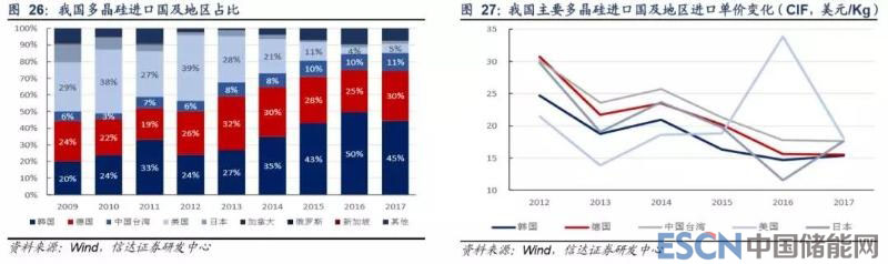 從具體進口來源來看,韓國是我國第一大多晶硅進口國,占我國進口總量的 45%左右,而且由于 OCI、Hankook 等企業(yè)進口 關(guān)稅相對較低,近年來進口量占比呈擴大趨勢;德國是第二大進口國,進口量占 30%左右,主要為 Wacker 產(chǎn)多晶硅產(chǎn)品; 臺灣沒有多晶硅產(chǎn)能,美國等國生產(chǎn)企業(yè)借道臺灣以規(guī)避“雙反”征稅,但美國+臺灣整體進口量占比呈下滑趨勢,目前在 15% 左右。