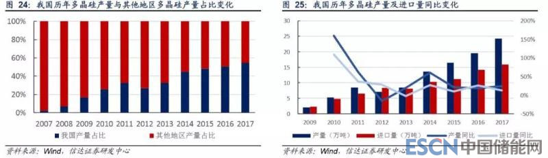 保利協(xié)鑫(江蘇中能)、特變電工(新特能源)、通威股份(四川永祥)和大全新能源是我國四大多晶硅生產(chǎn)企業(yè),截至 2017 年其合計產(chǎn)能為 15 萬噸,合計市占率達 54%,且四家在未來 1-2 年內(nèi)均有萬噸級擴產(chǎn)計劃,合計新增產(chǎn)能約 13 萬噸,基本 與 2017 年我國多晶硅進口數(shù)量相當。