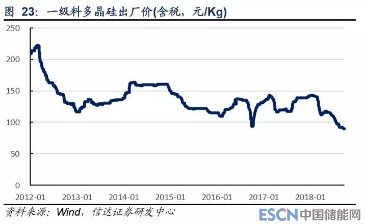 今年以來,受國內(nèi)新增產(chǎn)能投產(chǎn)以及 531 新政對產(chǎn)業(yè)鏈的沖擊,多晶硅價格持續(xù)下降,截至 2018 年 9 月底,國內(nèi)多晶硅一 級料出廠價為 89.43 元/Kg,已創(chuàng) 2012 年以來新低。但我們認為,受光伏平價上網(wǎng)進程加速影響,降低多晶硅價格是降低電 站單位投資成本的重要部分,我們預(yù)計未來多晶硅價格大幅反彈的概率較小,大概率仍將呈震蕩下行趨勢。