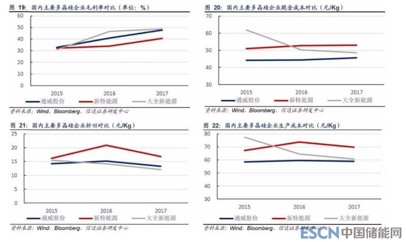 從四家企業(yè)營收規(guī)模來看,江蘇中能由于股東保利協(xié)鑫同時從事硅片業(yè)務(wù),對外銷售多晶硅數(shù)量較少,營收規(guī)模較小,新特 能源由于多晶硅產(chǎn)能較大,營收規(guī)模較大,2017 年營收為 35 億元,通威永祥和大全新能源 2017 年多晶硅營收分別為 18 和 20 億元。